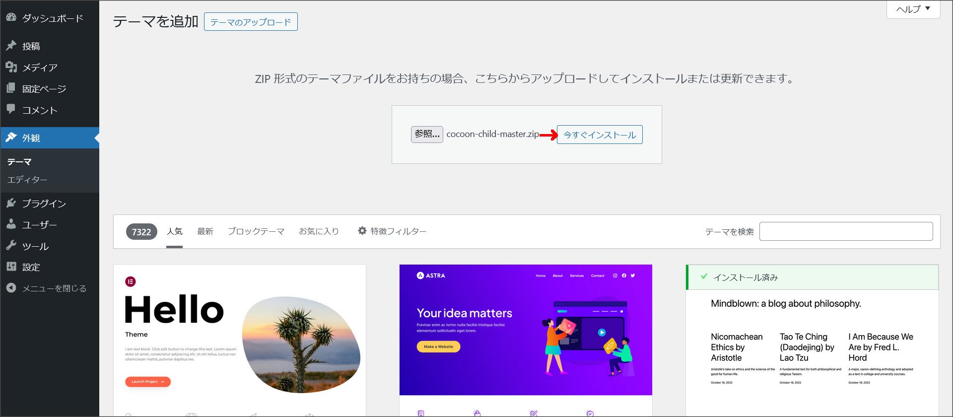 子テーマを選択すると、「今すぐインストール」をクリックしてインストールを開始します。